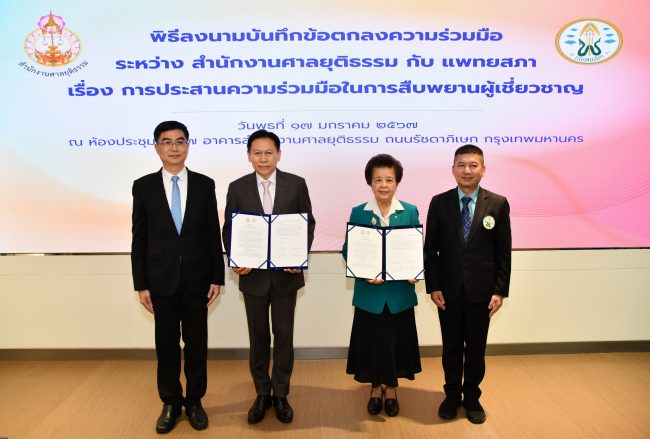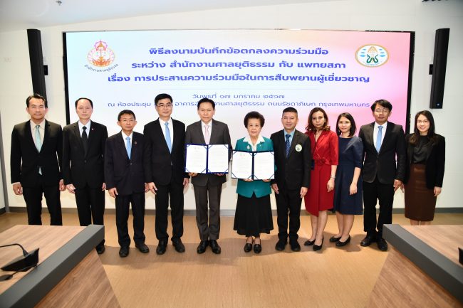 นายธานี สิงหนาท เลขาธิการสำนักงานศาลยุติธรรม กล่าวว่า สำนักงานศาลยุติธรรม และแพทยสภา ได้ลงนามบันทึกข้อตกลงความร่วมมือกันในเรื่องการสืบพยานผู้เชี่ยวชาญ เพื่อคุ้มครองสิทธิของคู่ความที่จะได้รับการพิจารณาคดีโดยสะดวกรวดเร็วและเป็นธรรม โดยคำนึงถึงประชาชนที่ต้องได้รับการบริการด้านสาธารณสุขในเวลาเดียวกันตลอดจนเพื่อให้การขับเคลื่อนกระบวนการเปลี่ยนผ่านสู่ยุคดิจิทัล โดยจะร่วมมือกันเกี่ยวกับการสืบพยานผู้เชี่ยวชาญทางอิเล็กทรอนิกส์ ณ สถานที่แพทย์ปฏิบัติงาน โดยการถ่ายทอดสัญญาณภาพและเสียงในลักษณะการประชุมทางจอภาพผ่านระบบอิเล็กทรอนิกส์