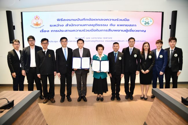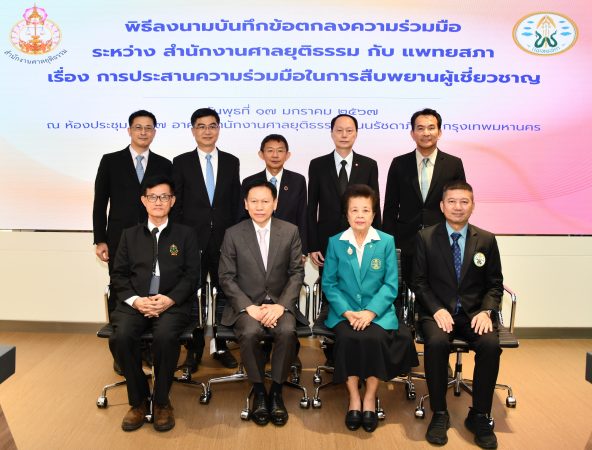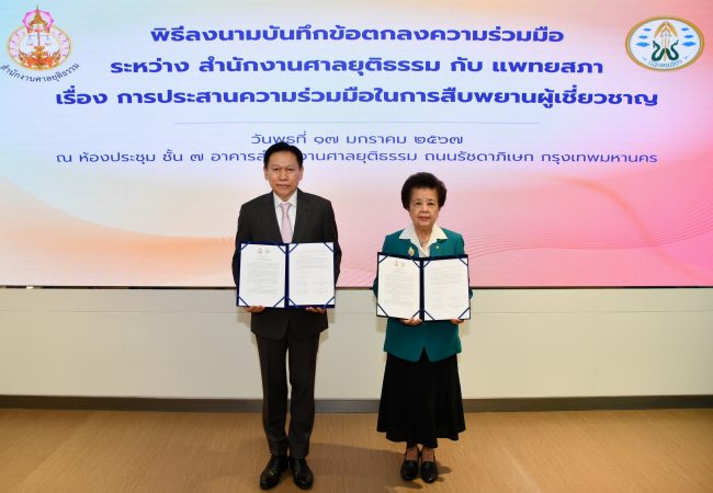 วันนี้ (17 ม.ค.67) ที่ห้องประชุม ชั้น 7 อาคารสำนักงานศาลยุติธรรม (แห่งใหม่) ถ.รัชดาภิเษก กรุงเทพฯ นายธานี สิงหนาท เลขาธิการสำนักงานศาลยุติธรรม และ ศาสตราจารย์เกียรติคุณ แพทย์หญิงสมศรี เผ่าสวัสดิ์ นายกแพทยสภา ร่วมลงนามบันทึกข้อตกลงว่าด้วยเรื่อง การประสานความร่วมมือในการสืบพยานผู้เชี่ยวชาญ ณ ห้องประชุม ชั้น 7 อาคารสำนักงานศาลยุติธรรม (แห่งใหม่) ถ.รัชดาภิเษก กรุงเทพฯ