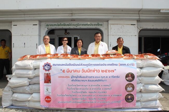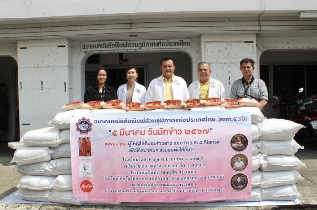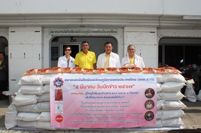วันนี้ (4 มี.ค.67) ที่สมาคมหนังสือพิมพ์ส่วนภูมิภาคแห่งประเทศไทย (สภท.59ปี) เขตดุสิต กรุงเทพฯ นายอนันต์ นิลมานนท์ นายกสมาคมหนังสือพิมพ์ส่วนภูมิภาคแห่งประเทศไทย พร้อมด้วย นางวันทนา วิริยะกุล อุปนายกภาคใต้ สภท., นายภากร ยังแจ่ม เลขาธิการ สภท., นายธวัชชัย เฟื่องอนันต์ กรรมการ สภท. ร่วมมอบข้าวสารจำนวน 500 ถุงๆ ละ 5 กิโลกรัม เนื่องในโอกาส “5 มีนาคม วันนักข่าว 2567”