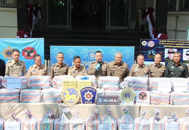 วันนี้ (18 มี.ค.67) ที่กองบัญชาการตำรวจภูธรภาค 1 (บช.ภ.1) พล.ต.อ.กิตติ์รัฐ พันธุ์เพ็ชร์ รอง ผบ.ตร. พร้อมด้วย พล.ต.ท.อัคราเดช พิมลศรี ผู้ช่วย ผบ.ตร., พล.ต.ท.นิรันดร เหลื่อมศรี ผู้ช่วย ผบ.ตร., พล.ต.ท.จิรสันต์ แก้วแสงเอก ผบช.ภ.1, พล.ต.ต.นราเดช ทิพย์รักษ์ รอง ผบช.ภ.1, พล.ต.ต.ชยานนท์ มีสติ รอง ผบช.ภ.1, พล.ต.ท.คีรีศักดิ์ ตันตินวะชัย ผบช.ปส., พล.ต.อาทิตย์ ม่วงเล็ก ผบ.ขกท., พล.ต.ต.ธรรมนูญ เชาวะวนิชย์ ผบก.ภ.จว.สระบุรี, พล.ต.ต.อภิรักษ์ เวชกาญจนา ผบก.ภ.จว.ลพบุรี และ นายนิยม ช่างพินิจ ผู้ช่วยเลขานุการรัฐมนตรีว่าการกระทรวงมหาดไทย (ผู้แทน นายชาดา ไทยเศรษฐ์ รัฐมนตรีช่วยว่าการกระทรวงมหาดไทย) ร่วมกันแถลงการณ์จับกุม นายวสันต์ หรือ จ้อ อายุ 33 ปี และ นายยศพล หรือ เท่ห์ อายุ 30 ปี ผู้ต้องหา พร้อมของกลางยาบ้า 10,000,000 เม็ด รถบรรทุกปูน ยี่ห้อฮีโน่ สีขาว ที่ใช้ลำเลียงยาเสพติด 1 คัน รถยนต์ยี่ห้อฮอนด้าแจ๊ส สีขาว ที่ใช้สำรวจเส้นทาง 1 คัน และอาวุธปืนสั้น ขนาด 9 มม. บรรจุกระสุน 14 นัด โดยจับกุมได้ที่ บริเวณริมถนนเลี่ยงเมืองลพบุรี (ขาเข้า สระบุรี) ม.6 ต.ป่าตาล อ.เมืองลพบุรี จ.ลพบุรี เมื่อวันที่ 17 มี.ค.67 เวลาประมาณ 08.45 น.