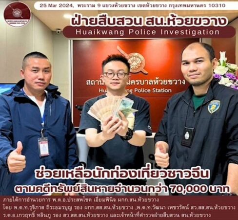 เมื่อวันที่ 25 มี.ค.67 เวลาประมาณ 00.31 น. พนักงานสอบสวน สน.ห้วยขวาง ได้รับแจ้งจาก Mr.Zhang Weiนักท่องเที่ยวชาวจีน ว่าได้ลืมกระเป๋าสตางค์ มีทรัพย์สินเป็นเงินสดจำนวน 70,000บาท ไว้บนรถแท็กซี่ ที่โดยสารมา จึงมาแจ้งความไว้เป็นหลักฐาน เพื่อให้ตำรวจช่วยดำเนินการตามหาทรัพย์สินดังกล่าวมาคืน โดยผู้แจ้ง ได้ให้การกับทางพนักงานสอบสวนว่า ได้โดยสารรถยนต์แท็กซี่สีเขียว – เหลือง ไม่ทราบป้ายทะเบียน โดเรียกรถ แท็กซี่คันดังกล่าว จากร้านอาหาร กันเอง จุดหมายปลายทาง เบลล์คอนโด ถนนพระราม 9 แขวงและเขตห้วยขวาง ต่อมาเมื่อถึงจุดหมาย หลังจากลงรถแล้วจึงทราบว่า ลืมกระเป๋าสตางค์ไว้ในรถ โดยในกระเป๋าสตางค์ใบอันเก่า มีทรัพย์สิน เป็นเงินสด จำนวน 70,000 บาท