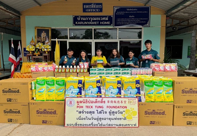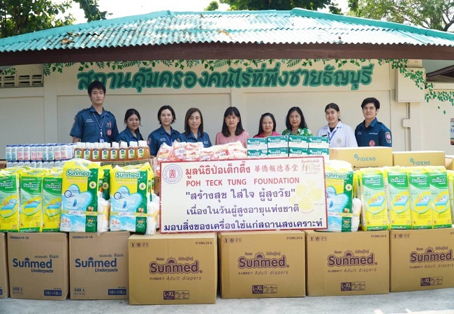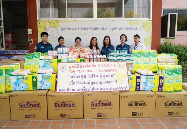 พร้อมกันนี้ มูลนิธิป่อเต็กตึ๊ง ยังได้ลงพื้นที่มอบสิ่งของเครื่องใช้จำเป็น ในโครงการ “ป่อเต็กตึ๊ง สร้างสุข ใส่ใจ ผู้สูงวัย” ประจำปี 2567 ประกอบด้วย ผ้าอ้อมสำเร็จรูป แผ่นรองซับ หน้ากากอนามัย น้ำยาฆ่าเชื้อโรค ผงซักฟอก และแป้งเย็น ให้แก่ผู้สูงวัยในสถานคุ้มครองคนไร้ที่พึ่งนนทบุรี จ.นนทบุรี ศูนย์พัฒนาการจัดสวัสดิการสังคมผู้สูงอายุปทุมธานี จ.ปทุมธานี สถานคุ้มครองคนไร้ที่พึ่งชายธัญบุรี จ.ปทุมธานี สถานคุ้มครองคนไร้ที่พึ่งหญิงธัญบุรี จ.ปทุมธานี สถานสงเคราะห์คนพิการและทุพพลภาพพระประแดง จ.สมุทรปราการ สถานสงเคราะห์คนชราเฉลิมราชกุมารี (หลวงพ่อเปิ่นอุปถัมภ์) จ.นครปฐม สถานสงเคราะห์คนชรานครปฐม จ.นครปฐม สถานคุ้มครองและพัฒนาคนพิการการุณยเวศม์ จ.ชลบุรี สถานสงเคราะห์คนชราบ้านเขาบ่อแก้ว จ.นครสวรรค์ และ ศูนย์พัฒนาการจัดสวัสดิการสังคมผู้สูงอายุวาสนะเวศม์ จ.พระนครศรีอยุธยา รวม 10 แห่ง รวมมูลค่าทั้งสิ้น 728,500 บาท เพื่อเป็นขวัญและกำลังใจแก่ผู้สูงอายุ เนื่องในวันผู้สูงอายุแห่งชาติ ประจำปี 2567 โดยมี ผู้บริหารของสถานสงเคราะห์แต่ละแห่งเป็นผู้รับมอบ