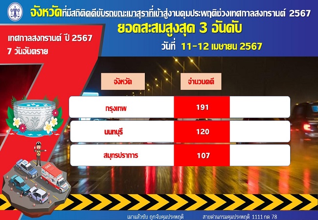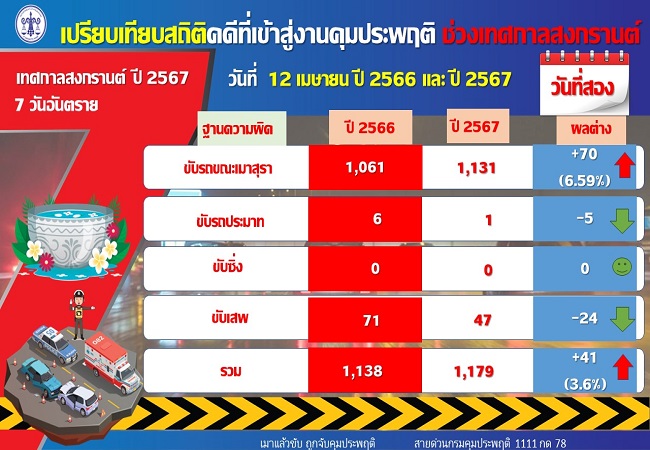 วันนี้ (13 เม.ย.67) นายเรืองศักดิ์ สุวารี อธิบดีกรมคุมประพฤติ กล่าวว่า วันที่สองของการควบคุมเข้มงวดในช่วง 7 วันอันตราย (12 เมษายน 2567) มีคดีที่เข้าสู่กระบวนการคุมความประพฤติทั้งสิ้น 1,179 คดี เป็นคดีขับรถขณะเมาสุรา 1,131 คดี คดีขับรถประมาท 1 คดี คดีขับเสพ 47 คดี สถิติคดีเมาขับสะสมสูงสุดอันดับหนึ่งได้แก่ กรุงเทพมหานคร มี 191 คดี รองลงมา นนทบุรี 120 คดี และอันดับสาม สมุทรปราการ 107 คดี เมื่อเปรียบเทียบสถิติคดีเข้าสู่งานคุมประพฤติในวันที่สองของช่วงเทศกาลสงกรานต์ พ.ศ. 2566 และ พ.ศ. 2567 พบว่า คดีขับรถขณะเมาสุรา ปี พ.ศ. 2566 จำนวน 1,061 คดี และปี พ.ศ. 2566 มีจำนวน 1,131 คดี เพิ่มขึ้น 70 คดี คิดเป็นร้อยละ 6.59