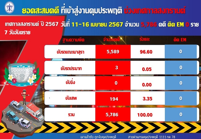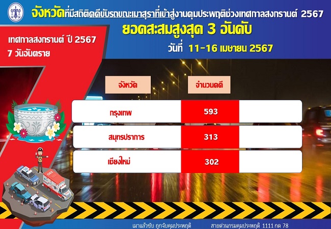 เมื่อวันที่ 17 เม.ย.67 นายเรืองศักดิ์ สุวารี อธิบดีกรมคุมประพฤติ เปิดเผยถึง สถิติคดีที่ศาลสั่งคุมความประพฤติ (16 เมษายน 2567) มีจำนวนทั้งสิ้น 1,654 คดี จำแนกเป็น คดีขับรถในขณะเมาสุรา 1,616 คดี และคดีขับเสพ 38 คดี สำหรับยอดรวมสะสม 6 วัน ที่มีการควบคุมเข้มตั้งแต่วันที่ 11-16 เมษายน 2567 มียอดสะสม จำนวน 5,786 คดี จำแนกเป็น คดีขับรถขณะเมาสุรา 5,589 คดี คิดเป็นร้อยละ 96.6 คดีขับรถประมาท 3 คดี คิดเป็นร้อยละ 0.05 และคดีขับเสพ 194 คดี คิดเป็นร้อยละ 3.35 หากเปรียบเทียบสถิติคดีเข้าสู่คุมประพฤติ พ.ศ. 2566 กับ พ.ศ. 2567 ยอดสะสม 6 วัน (11-16 เมษายน 2567) พบว่า คดีขับรถขณะเมาสุรา ปี พ.ศ. 2566 จำนวน 6,705 คดี และ ปี พ.ศ. 2567 มีจำนวน 5,589 คดี ลดลง 1,116 คดี คิดเป็นร้อยละ 16.64 จังหวัดที่มีสถิติคดีเมาแล้วขับสะสมสูงสุด 3 อันดับได้แก่ กรุงเทพมหานคร 493 คดี สมุทรปราการ 313 คดี และ เชียงใหม่ 302 คดี