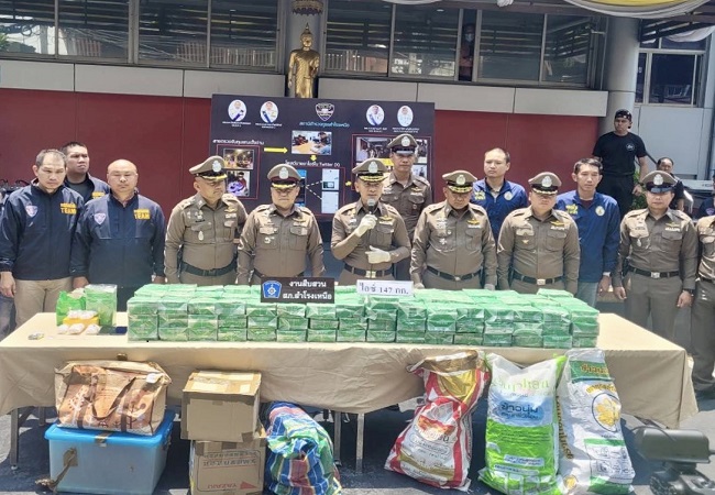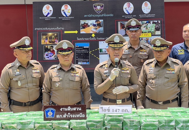 เมื่อวันที่ 21 เม.ย.67 ที่สภ.สำโรงเหนือ พล.ต.ท.จิรสันต์ แก้วแสงเอก ผบช.ภ.1 พร้อมด้วย พล.ต.ต.นราเดช ทิพย์รักษ์ รอง ผบช.ภ.1 ,พล.ต.ต.ชยานนท์ มีสติ รอง ผบช.ภ.1 ,พล.ต.ต. วิชิต บุญชินวุฒิกุล ผบก.ภ.จว.สมุทรปราการ, พ.ต.อ.วิโรจน์ ตัดโส ผกก.สภ.สำโรงเหนือ ,พ.ต.ท.จุลินทร์ ตลาดธานี รอง ผกก.สส.สภ.สำโรงเหนือ และเจ้าหน้าที่ชุดสืบสวน สภ.สำโรงเหนือ ร่วมแถลงการจับกุม นายนเรนท์ศักดิ์ (นามสมมุติ) อายุ 26 ปี ชาว จ.มหาสารคาม พร้อมของกลางยาไอซ์ จำนวน 147 กิโลกรัม มูลค่าประมาณ 25,000,000 บาท โดยกล่าวหาว่า “จำหน่ายโดยการครอบครองเพื่อหน่ายยาเสพติดให้โทษประเภท 1 (ไอซ์) อันเป็นการกระทำเพื่อการค้าและก่อให้เกิดการแพร่กระจายในกลุ่มประชาชนโดยไม่ได้รับอนุญาต”