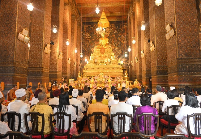 เมื่อวันที่ 21 เม.ย.67 พระเทพวชิรโมลี ผู้ช่วยเจ้าอาวาสวัดพระเชตุพนวิมลมังคลาราม เป็นประธานฝ่ายสงฆ์ นายเสริมศักดิ์ พงษ์พานิช รัฐมนตรีว่าการกระทรวงวัฒนธรรม (รมว.วธ.) เป็นประธานฝ่ายฆราวาส ในพิธีบำเพ็ญกุศลอุทิศถวาย สมเด็จพระบูรพมหากษัตริยาธิราช และพิธีตักบาตรพระสงฆ์ 99 รูป งาน “ใต้ร่มพระบารมี 242 ปี กรุงรัตนโกสินทร์” โดยมี นายพลภูมิ วิภัติภูมิประเทศ ผู้ช่วยรัฐมนตรีว่าการกระทรวงวัฒนธรรม นางลาลีวรรณ กาญจนจารี ผู้ช่วยรัฐมนตรีประจำกระทรวงวัฒนธรรม นางยุพา ทวีวัฒนะกิจบวร ปลัดกระทรวงวัฒนธรรม นายชัยพล สุขเอี่ยม อธิบดีกรมการศาสนา ผู้บริหารกระทรวงวัฒนธรรม และผู้แทนหน่วยงานต่าง ๆ เข้าร่วมงาน ณ พระอุโบสถ วัดพระเชตุพนวิมลมังคลาราม เขตพระนคร กรุงเทพมหานคร