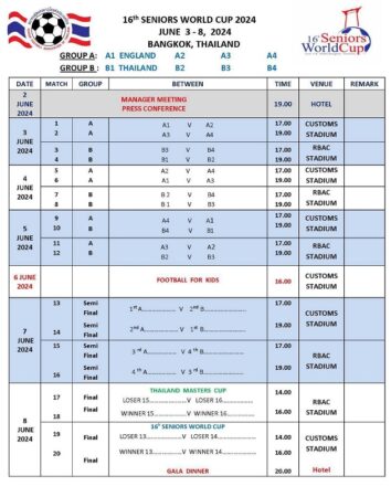 ขอเชิญร่วมส่งเสียงเชียร์และเป็นกำลังใจให้กับทีมฟุตบอลอาวุโส ทีมชาติไทย ในการแข่งขันรายการ “SENIOR WORLD CUP 2024” ครั้งที่ 16 ระหว่างวันที่ 3-8 มิ.ย 67 ณ สนามศุลกากร ลาดกระบัง 54 และ สนาม ม.รัตนบัณฑิต โดยทีมลูกหนังอาวุโสทีมชาติไทย อยู่ในกลุ่ม B ซึ่งจะมีการจับสลากแบ่งสายเร็ว ๆ นี้