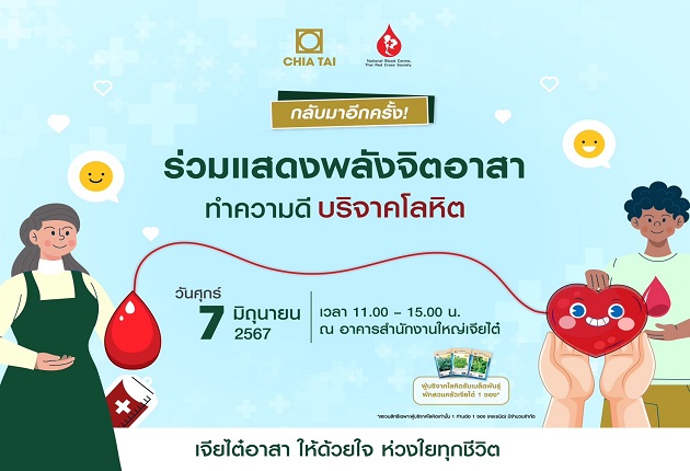 กลับมาอีกครั้งกับโครงการ “เจียไต๋อาสา ให้ด้วยใจ ห่วงใยทุกชีวิต” ครั้งที่ 3 โดย บริษัท เจียไต๋ จำกัด ผู้นำธุรกิจนวัตกรรมการเกษตรของไทย ร่วมกับ สภากาชาดไทย ขอเชิญชวนผู้ที่สนใจร่วมแสดงพลังจิตอาสาบริจาคโลหิต ไม่ว่าจะหมู่เลือดไหนก็สามารถต่อชีวิตผู้ป่วยได้ พร้อมรับเมล็ดพันธุ์ผักสวนครัวเจียไต๋เป็นของที่ระลึก ในวันที่ 7 มิถุนายน พ.ศ. 2567 เวลา 11.00-15.00 น. ณ อาคารสำนักงานใหญ่เจียไต๋ สุขุมวิท 60