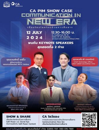คณะนิเทศศาสตร์ สถาบันการจัดการปัญญาภิวัฒน์ (พีไอเอ็ม) จัดงาน CA PIM SHOW CASE “Communication in New Era เชื่อมโยงโลกใหม่ด้วยการสื่อสาร เสวนาพิเศษ หัวข้อ เชื่อมโยงโลกใหม่ด้วยการสื่อสาร Soft Power และเครื่องมือ Zocial Eye กับการผลักดัน Soft Power Content” พบกับ ผู้เชี่ยวชาญจากองค์กรวิชาชีพ นำโดย คุณพงศ์ระพี เจนจรัตน์ Chief Technology Officer บริษัท ไวซ์ไซท์ (ประเทศไทย) จำกัด คุณเจนศักดิ์ แซ่อึ้ง ผู้จัดการบริหารคอนเทนต์ออนไลน์ PPTV Online และ คุณเรณุกา คลังเขษม Marketing Content & Production คุณบดินทรกานต์ พิทักษ์สรยุทธ ผู้สื่อข่าว PPTV HD36 ว่าที่บัณฑิตคณะนิเทศศาสตร์ พีไอเอ็ม ดำเนินรายการโดย คุณวีรชน แจ่มจันทร์ Senior Marketing บริษัท เดอะเดอมิส จำกัด และศิษย์เก่าคณะนิเทศศาสตร์ พีไอเอ็ม มาร่วมเติมพลังแห่งไอเดียด้านการสื่อสารยุคใหม่กับ CA โชว์ของ ที่บูธนิทรรศการแสดงผลงานของเหล่านวัตกรการสื่อสาร ในวันศุกร์ที่ 12 กรกฎาคม 2567 เวลา 12.30 – 16.00 น. ณ ห้อง Auditorium ชั้น 16 อาคาร CP ALL Academy สถาบันการจัดการปัญญาภิวัฒน์ ถนนแจ้งวัฒนะ