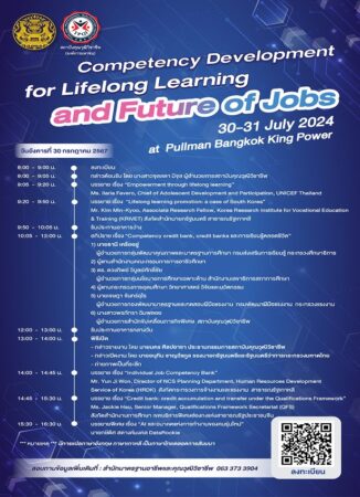 นางสาวจุลลดา มีจุล ผู้อำนวยการสถาบันคุณวุฒิวิชาชีพ เปิดเผยว่า สถาบันคุณวุฒิวิชาชีพเตรียมจัดงานสัมมนานานาชาติ เรื่อง “Competency Development for Lifelong Learning and Future of Jobs” ณ โรงแรมพูลแมน แบงก์ค็อก คิง พาวเวอร์ เพื่อแลกเปลี่ยนประสบการณ์การขับเคลื่อนประเทศที่ต้องเรียนรู้ พึ่งพาทักษะบนโลกดิจิทัลรองรับการก้าวสู่ Future of Jobs หรืองานแห่งอนาคต และนำไปสู่การเรียนรู้ตลอดชีวิต ซึ่งเป็นแนวทางที่สถาบันคุณวุฒิวิชาชีพได้บูรณาการการทำงานร่วมกับหลายหน่วยงานในการพัฒนา สร้างการยอมรับในความรู้ ความสามารถ และทักษะในการทำงานของกำลังคน ไม่ว่าจะเป็นโครงการพัฒนาสมรรถนะเพื่อการเรียนรู้ตลอดชีวิต และสร้างโอกาส ลดความเหลื่อมล้ำ
