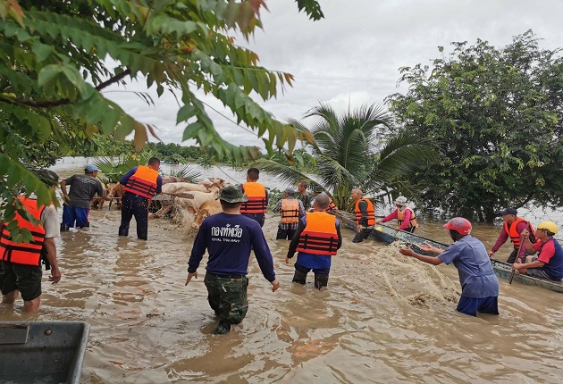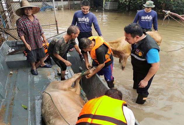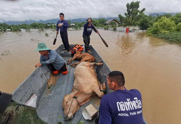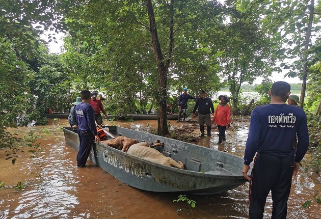 ตามที่ได้เกิดอุทกภัยขึ้นในหลายพื้นที่ของประเทศในส่วนของกองทัพเรือ โดยศูนย์บรรเทาสาธารณภัยกองทัพเรือได้สั่งการให้ศูนย์บรรเทาสาธารณภัยของหน่วยงานกองทัพเรือในพื้นที่ต่าง ๆ จัดกำลังพลพร้อม ยุทโธปกรณ์ เร่งให้การช่วยเหลือพี่น้องประชาชนในพื้นที่รับผิดชอบ ที่ได้รับความเดือดร้อน พร้อมกันนี้ยังได้เตรียมความพร้อมในการปฏิบัติเชิงรุกทั้งด้านองค์บุคคล องค์วัตถุ และองค์ยุทธวิธี ให้มีความพร้อมในการช่วยเหลือประชาชนได้ทันที โดยบูรณาการและประสานงานกับหน่วยงานต่าง ๆ ในพื้นที่อย่างต่อเนื่อง รวมทั้งให้มีการสำรวจความเดือดร้อนและความต้องการของประชาชน พร้อมทั้งติดตามการแจ้งเตือนภัยจากหน่วยงานที่เกี่ยวข้องอย่างใกล้ชิด เพื่อให้สามารถช่วยเหลือและบรรเทาความเดือดร้อนให้กับประชาชนได้อย่างมีประสิทธิภาพ โดยในส่วนของหน่วยเรือรักษาความสงบเรียบร้อยตามลำแม่น้ำโขง เขตเชียงรายได้จัดกำลังพลพร้อมเรือท้องแบนให้การช่วยเหลือประชาชนและขนย้ายโค จำนวน 30 ตัวที่ติดน้ำท่วมจากน้ำป่าไหลหลากและระดับน้ำในน้ำล้นตลิ่ง ในพื้นที่อำเภอเชียงของจังหวัดเชียงราย ไปยังพื้นที่ปลอดภัย