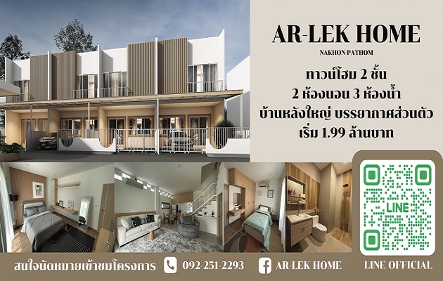ถูกใจสำหรับคนที่อยากมีบ้านสวย ราคาถูก แถมเดินทางสะดวก ไม่ไกลจากกรุงเทพมหานครมากนัก กับโครงการ Ar-Lek Home Nakhon Pathom ทาวน์โฮมหลังใหญ่ สไตล์มินิมอล บรรยากาศส่วนตัว สัมผัสกับบทนิยาม “บ้านเพื่อการพักผ่อน” ตอบโจทย์ทุกคุณภาพความเป็นอยู่ บ้านทาวน์โฮม 2 ชั้น 2 ห้องนอน 3 ห้องน้ำ ราคาเริ่มต้น 1.99-2.99 ล้านบาท เดินทางสะดวกใกล้มหาวิทยาลัยราชภัฏนครปฐม และมหาวิทยาลัยศิลปากร นอกจากนี้ยังใกล้โรงพยาบาลสินเเพทย์ และโรงพยาบาลกรุงเทพสนามจันทร์ เท่านั้นไม่พอ ยังใกล้ห้าง Central นครปฐม แถมยังใกล้จุดขึ้น/ลงมอเตอร์เวย์อีกด้วย