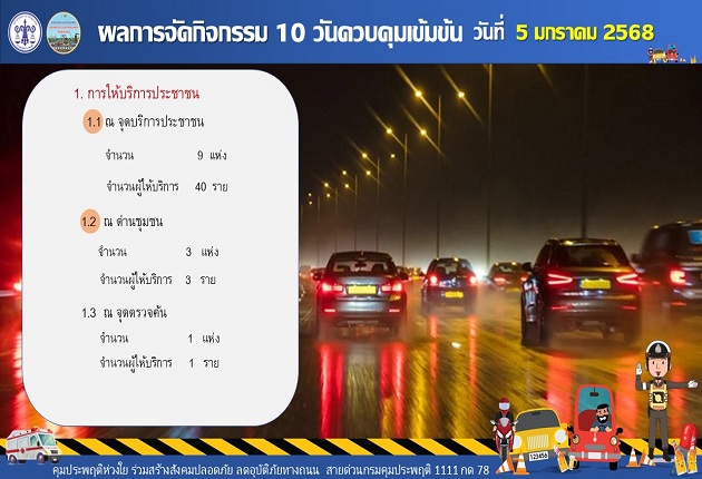 ทั้งนี้ สำนักงานคุมประพฤติทั่วประเทศได้จัดกิจกรรมสร้างความปลอดภัยให้กับประชาชนอย่างต่อเนื่อง โดยการผสานกำลังสำนักงานคุมประพฤติทั่วประเทศ อาสาสมัครคุมประพฤติ ผู้ถูกคุมประพฤติ และภาคีเครือข่าย ในการสนับสนุนการปฏิบัติงานของเจ้าหน้าที่ ณ จุดบริการประชาชน ด่านชุมชน และด่านตรวจค้นบริเวณทางสายรองที่มีความเสี่ยงสูงในการเกิดอุบัติเหตุ รวม 13 จุด โดยมีผู้เข้าร่วมกิจกรรมกว่า 44 คน