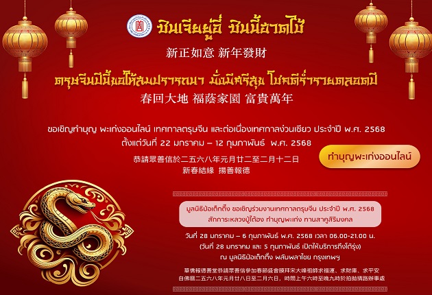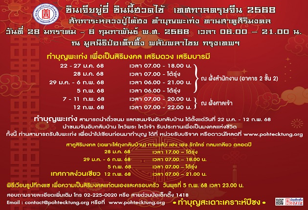 พิธีสวดชัยมงคลคาถา [พะเก่ง] สำหรับท่านที่สะดวกการทำบุญออนไลน์ มูลนิธิป่อเต็กตึ๊ง จัดให้มีการลงชื่อสวดชัยมงคลคาถา ทำบุญพะเก่งออนไลน์ผ่านทางเว็บไซต์ได้ตั้งแต่วันที่ 22 มกราคม พ.ศ. 2568 ที่ www.pttfny.net/cnny ให้ผู้มีจิตศรัทธาทุกท่านได้ร่วมพิธีเพื่อสริมความมั่งมีศรีสุขตลอดปีมะเส็ง ติดต่อสอบถามข้อมูลเพิ่มเติมได้ที่ สายด่วนป่อเต็กตึ๊ง 1418
