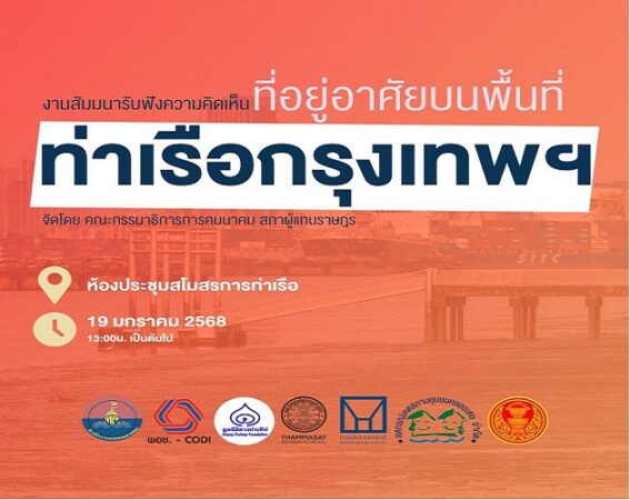 คณะกรรมาธิการการคมนาคม สภาผู้แทนราษฎร ขอเชิญประชาชนและผู้ที่สนใจเข้าร่วมงานสัมมนารับฟังความคิดเห็นเกี่ยวกับที่อยู่อาศัยบนพื้นที่ท่าเรือกรุงเทพฯ เพื่อร่วมแลกเปลี่ยนความคิดเห็นและเสนอแนะแนวทางการพัฒนาพื้นที่อย่างยั่งยืน ในวันอาทิตย์ที่ 19 มกราคม 2568 เวลา 13.00 น. เป็นต้นไป ที่ห้องประชุมสโมสรการท่าเรือ
