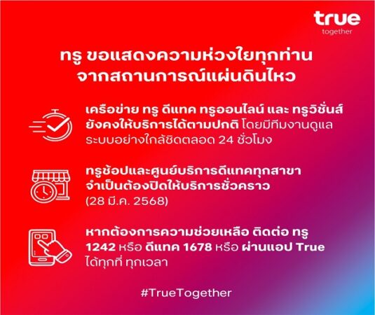 อย่างไรก็ตาม ศูนย์บริการทรูและดีแทคช้อปจะงดให้บริการชั่วคราว เพื่อดำเนินการตรวจสอบความปลอดภัยของสถานที่อย่างละเอียด โดยทรูให้ความสำคัญสูงสุดต่อความปลอดภัยของทั้งลูกค้าและพนักงาน โดยจะเปิดให้บริการอีกครั้งในวันพรุ่งนี้ (29 มีนาคม 2568) สำหรับศูนย์บริการฯที่อยู่ภายในศูนย์การค้า จะเปิดให้บริการตามนโยบายการเปิดให้บริการของศูนย์การค้า ทั้งนี้ ลูกค้าสามารถใช้บริการหลังการขายผ่านแอปพลิเคชันของทรู หรือคอลเซ็นเตอร์ ทรู 1242 และ ดีแทค 1678 ได้ตามปกติ