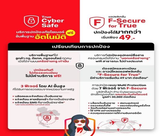 โลกดิจิทัลหมุนเร็วจนน่าตกใจ! ทรูห่วงใย พร้อมปกป้องลูกค้าทุกคนจากภัยไซเบอร์ – ทั้งแบบไม่มีค่าใช้จ่ายเพิ่มกับ True CyberSafe และแบบจัดพิเศษเมื่อใช้งานนอกเครือข่าย กับ F-Secure for True