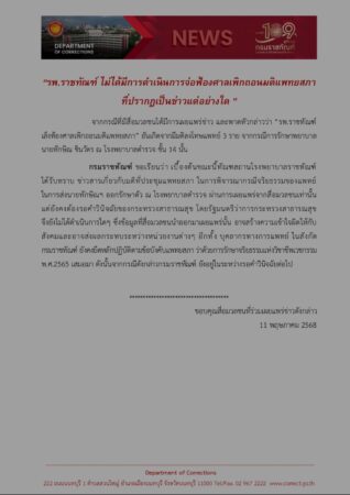 รพ.ราชทัณฑ์ ไม่ได้มีการดำเนินการจ่อฟ้องศาลเพิกถอนมติแพทยสภาที่ปรากฏเป็นข่าวแต่อย่างใด