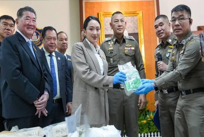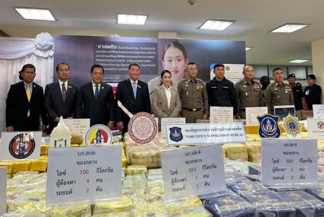 วันนี้ (29 พ.ค.68) เวลา 09.00 น. ที่กองบัญชาการตำรวจปราบปรามยาเสพติด (บช.ปส.) น.ส.แพทองธาร ชินวัตร นายกรัฐมนตรี เป็นประธานการประชุมมอบนโยบายและแถลงผลการปฏิบัติ พร้อมด้วย นายภูมิธรรม เวชยชัย รองนายกรัฐมนตรี, พ.ต.อ.ทวี สอดส่อง รัฐมนตรีว่าการกระทรวงยุติธรรม, พล.ต.อ.กิตติ์รัฐ พันธุ์เพ็ชร์ ผบ.ตร., พล.ต.อ.ไกรบุญ ทรวดทรง รอง ผบ.ตร./ผอ.ศอ.ปส.ตร., พล.ต.อ.ประจวบ วงศ์สุข รอง ผบ.ตร./ประธานอนุกรรมการป้องกันปราบปรามการพักคอยยาเสพติดในพื้นที่ตอนในและสกัดกั้นการลำเลียงยาเสพติดลงสู่พื้นที่ภาคใต้, พล.ต.ท.สำราญ นวลมา ผู้ช่วย ผบ.ตร./รอง ผอ.ศอ.ปส.ตร., พล.ต.ท.สันติ ชัยนิรามัย ผบช.ปส. และคณะทูตจากประเทศต่าง ๆ