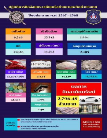 – จับกุมผู้กระทำผิดเกี่ยวกับยาเสพติดทุกข้อหาทั่วประเทศ 158,832 คดี ผู้ต้องหา 157,881 คน จับกุมตามหมายจับ 3,899 คน ดำเนินคดีข้อหาสมคบ สนับสนุน 2,338 คดีข้อหาฟอกเงิน 181 คดี ของกลางยาเสพติด ยาบ้า 645.93 ล้านเม็ด, ไอซ์ 34,223 กก., เฮโรอีน 938 กก., คีตามีน 4,471 กก. และยาอี 271,329 เม็ด ยึดอายัดทรัพย์ผู้ค้ายาเสพติด 8,064 ล้านบาท  พร้อมทั้งได้สั่งการให้ขยายผลถึงระดับเครือข่ายและผู้สั่งการ ถือเป็นสัญญาณเตือนแรง! ถึงกลุ่มค้ายาที่ยังเหลืออยู่ว่า ไม่มีที่ยืนในแผ่นดินไทย