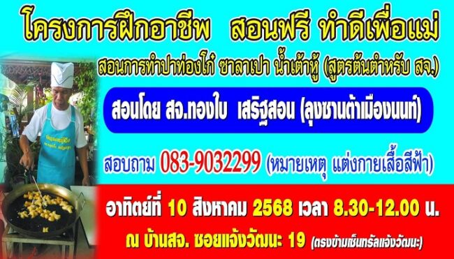 เมื่อวันที่ 17 ก.ค.68 ที่ซอยแจ้งวัฒนะ 19 อ.ปากเกร็ด จ.นนทบุรี สจ.ทองใบ เสริฐสอน สมาชิกสภาจังหวัดนนทบุรี เจ้าของสโลแกน “อุ้มหมาไปหาหมอ” และ สโลแกน “หวยแดกแลกไข่” ขวัญใจชาวบ้านเมืองปากเกร็ด จ.นนทบุรี เปิดโครงการ “ฝึกอาชีพ สอนฟรี ทำดีเพื่อแม่” เพื่อถวายเป็นพระราชกุศลเนื่องในวันแม่ “12 สิงหา” กิจกรรมดังกล่าว เปิดสอนการทำปาท่องโก๋ ซาลาเปา น้ำเต้าฮู้ (สูตรต้นตำรับ สจ.) และจะได้เป็นอาชีพเสริมในครอบครัว