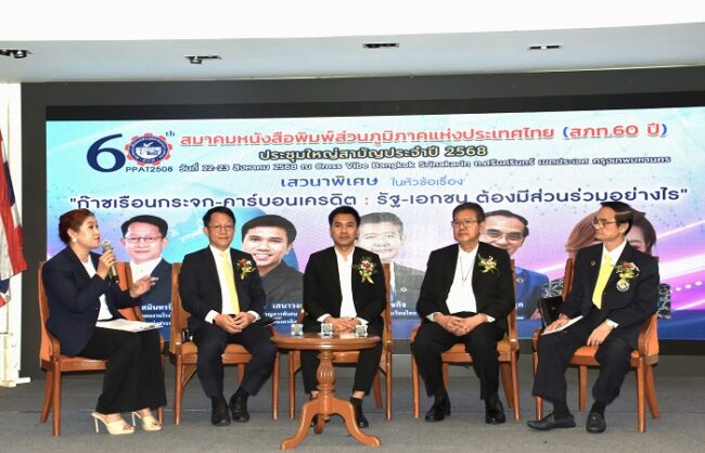 เมื่อเวลา 09.00 น. วันที่ 23 ส.ค.68 สมาคมหนังสือพิมพ์ส่วนภูมิภาคแห่งประเทศไทย (สภท.60ปี) จัดการประชุมใหญ่สามัญประจำปี 2568 (รับรองงบดุล 2567) ได้จัดให้มีการเสวนาพิเศษ เรื่อง “ก๊าซเรือนกระจก-คาร์บอนเครดิต : รัฐ-เอกชน ต้องมีส่วนร่วมอย่างไร” โดยได้รับเกียรติจากวิทยากรที่มีองค์ความรู้ อาทิ นายเอกรัฐ สมินทรปัญญา ผู้ช่วยผู้ว่าการแผนงานโรงไฟฟ้า การไฟฟ้าฝ่ายผลิตแห่งประเทศไทย (กฟผ.), นายอภิสิทธิ์ เสนาวงศ์ นักวิชาการชำนาญการพิเศษ สำนักรับรองคาร์บอนเครดิต (องค์การบริหารจัดการก๊าซเรือนกระจก “องค์การมหาชน”), นายอาทิตย์ เวชกิจ นายกสมาคมพลังงานหมุนเวียนไทย (RE100), ดร.สุวัฒน์ ทองธนากุล บรรณาธิการ Green & SD Manager Online (สื่อในเครือผู้จัดการ) ให้เกียรติมาร่วมวงเสวนา โดยมี น.ส.สุพัตรา สมถวนิช รองเลขาธิการสมาคมฯ เป็นพิธีกรดำเนินรายการ ณ Cross Vibe Bangkok Srinakarin (โรงแรมคิงปาร์ค อเวนิว) ถ.ศรีนครินทร์ ซ. 40 เขตประเวศ กรุงเทพฯ
