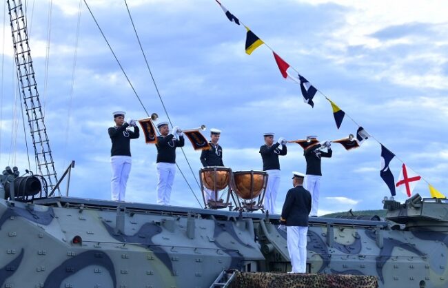 โอกาสนี้ ผู้บัญชาการทหารเรือ ได้ตรวจแถวกองทหารเกียรติยศ ก่อนเข้าร่วมพิธี โดย ผู้บัญชาการหน่วยบัญชาการนาวิกโยธิน ได้กล่าวเทิดเกียรติ ผู้บัญชาการทหารเรือ จากนั้น ผู้บัญชาการทหารเรือ ได้กล่าวขอบคุณ และอำลาหน่วย โดยหน่วยบัญชาการนาวิกโยธิน ได้จัดให้มีพิธีการเชิญธงลงและพิธีย่ำพระสุริย์ศรี เพื่อเป็นเกียรติแก่ ผู้บัญชาการทหารเรือ