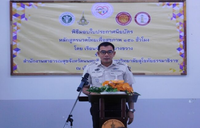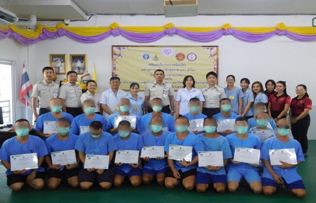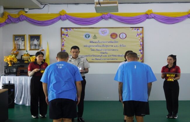 เมื่อเวลา 10.00 น. วันที่ 15 ต.ค.68 ที่เรือนจำกลางบางขวาง นายปราโมทย์ ทองศรี ผู้บัญชาการเรือนจำกลางบางขวาง มอบหมายให้ นายธนกฤต แก้วบุญทอง ผู้อำนวยการส่วนควบคุมผู้ต้องขัง เป็นประธานในพิธีมอบใบประกาศนียบัตรแก่ผู้สำเร็จการฝึกอบรมหลักสูตรการอบรมนวดไทยเพื่อสุขภาพ 150 ชั่วโมง โดยมี ทพ.อวิรุตต์ ตรุณทิพากร ผู้อำนวยการสถานพยาบาล และ นางจารุวรรณ เศรษฐสนิท พยาบาลวิชาชีพชำนาญการพิเศษ พร้อมด้วยเจ้าหน้าที่เรือนจำกลางบางขวาง สถานพยาบาลเรือนจำกลางบางขวาง ให้การต้อนรับ นางลัดดาวัลย์ ธเนศอนุกูล รองนายแพทย์สาธารณสุขจังหวัดนนทบุรี คณะอาจารย์สาขาวิทยาศาสตร์สุขภาพมหาวิทยาลัยสุโขทัยธรรมาธิราช ภญ.อรนุช รัตนศึกษา หัวหน้ากลุ่มงานการแพทย์แผนไทย สำนักงานสาธารณสุขจังหวัดนนทบุรี เข้าร่วมในพิธีมอบใบประกาศนียบัตรแก่ผู้สำเร็จการฝึกอบรมหลักสูตรการอบรมนวดไทยเพื่อสุขภาพ 150 ชั่วโมง ของกรมสนับสนุนบริการสุขภาพ กระทรวงสาธารณสุข มีผู้ต้องขังจิตอาสาสอบผ่านสำเร็จการฝึกอบรมทั้งสิ้น จำนวน 20 คน