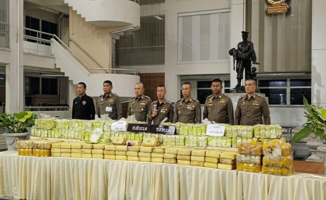 เมื่อเวลา 13.15 น. วันที่ 13 พ.ย.68 ที่กองบัญชาการตำรวจนครบาล (บช.น.) พล.ต.อ.สำราญ นวลมา รอง ผบ.ตร. พร้อมด้วย พล.ต.ท.สมประสงค์ เย็นท้วม ผู้ช่วย ผบ.ตร., พล.ต.ท.สยาม บุญสม ผบช.น., พล.ต.ต.ธีรเดช ธรรมสุธีร์ รองผบช.น., พล.ต.ต.วรศักดิ์ พิสิษฐบรรณกร ผบก.น.1, พ.ต.อ.ศักยะ แสงวรรณ รอง ผบก.น.1, พ.ต.อ.วิชัย สนสกุล ผกก.สส.บก.น.1 และชุดสืบสวน กก.สส.บก.น.1 ร่วมแถลงจับกุม นายจาย หนุ่มแลง (Mr.Sai Num Hlaing) อายุ 20 ปี สัญชาติ เมียนมาร์ และ น.ส.หอม ไม่มีนามสกุล อายุ 20 ปี สัญชาติ เมียนมาร์ พร้อมของกลาง ยาไอซ์ 300 กิโลกรัม และ ยาบ้า 2,400,000 เม็ด โทรศัพท์ 2 เครื่อง รถบรรทุก 1 คัน จับกุมได้ที่บริเวณริมถนน อ.บางบัวทอง จ.นนทบุรี เมื่อเวลา 01.00 น. ที่ผ่านมา