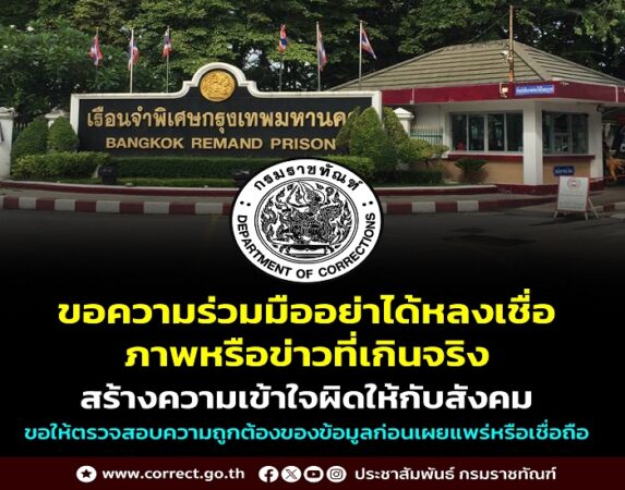 กรมราชทัณฑ์ จึงขอความร่วมมือพี่น้องประชาชน และสื่อมวลชนในการนำเสนอข้อมูลข่าวสาร หรือภาพที่ผิดไปจากความจริง อย่างรอบคอบ ถูกต้อง และไม่ก่อให้เกิดความเข้าใจคลาดเคลื่อนหรือบิดเบือนข้อเท็จจริงต่อสาธารณชน ซึ่งกรมราชทัณฑ์ ขอยืนยันถึงความมุ่งมั่นในการปฏิบัติงานด้วยความโปร่งใส เคารพต่อหลักสิทธิมนุษยชน และยึดมั่นในการดำเนินงานเพื่อประโยชน์ขององค์กรและประเทศชาติอย่างแท้จริง