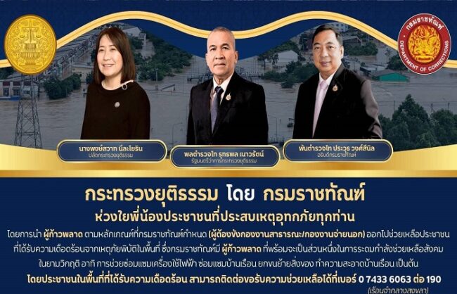 จากสถานการณ์อุทกภัยในพื้นที่ภาคใต้ กระทรวงยุติธรรม โดยกรมราชทัณฑ์ ขอแสดงความห่วงใยพี่น้องประชาชนในพื้นที่ประสบเหตุอุทกภัยทุกท่าน