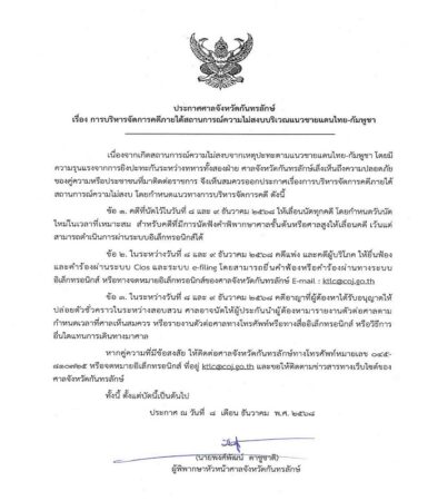 ศาลกันทรลักษ์ เลื่อนนัดทุกคดี 8-9 ธันวาคม 2568 เหตุปะทะชายแดนไทย-กัมพูชา แนะใช้ระบบอิเล็กทรอนิกส์ติดต่อราชการแทนการเดินทางมาศาล