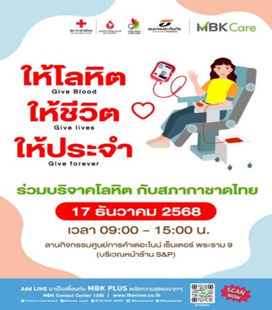 เดอะไนน์ เซ็นเตอร์ พระราม 9 ศูนย์การค้าในเครือเอ็ม บี เค เดินหน้ากิจกรรมบำเพ็ญประโยชน์ ภายใต้ MBK Care อาสาทำดีปันน้ำใจสู่สังคม โดยร่วมกับ ธนชาตประกันภัย และ สภากาชาดไทย เชิญร่วมกิจกรรมบริจาคโลหิต ให้โลหิต ให้ชีวิต ให้ประจำ ในวันพุธที่ 17 ธันวาคม 2568 เวลา 09.00 น. – 15.00 น. ผู้สนใจสามารถลงทะเบียนบริเวณ หน้าร้าน S&P ชั้น 1 ณ ห้องประชุม ชั้นใต้ดิน ศูนย์การค้าเดอะไนน์ เซ็นเตอร์ พระราม 9