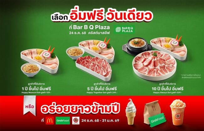 • ใช้สิทธิ์ เริ่มใช้สิทธิ์ อิ่มฟรีวันเดียว ที่บาร์บีคิว พลาซ่าพร้อมกันในวันที่ 24 ธ.ค.68 หรือ อร่อยยาวข้ามปี ที่ทรูคอฟฟี่ GrabFood หรือ McDonald’s ได้ตั้งแต่วันที่ 24 ธ.ค.68 – 31 ม.ค.69