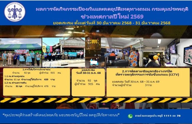 ขณะที่ยอดคดีสะสมตลอด 2 วัน (30-31 ธันวาคม 2568) รวมทั้งสิ้น 1,473 คดี แบ่งเป็น