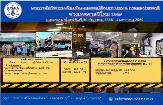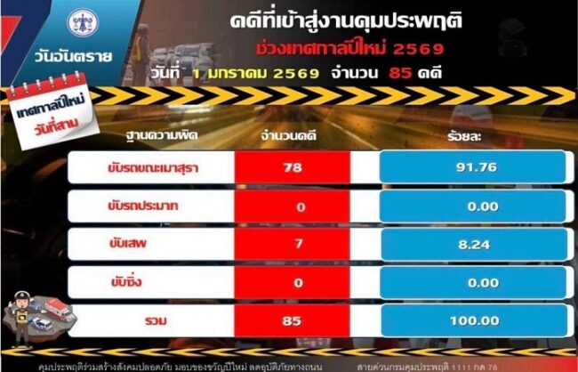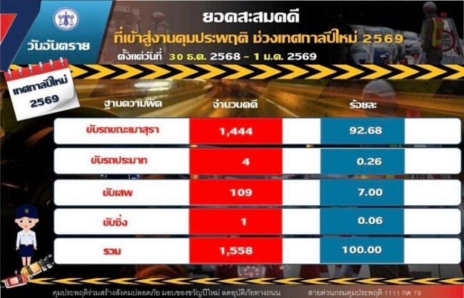 ขณะที่ยอดคดีสะสมตลอด 3 วัน (30 ธันวาคม 2568 – 1 มกราคม 2569) รวมทั้งสิ้น 1,558 คดี แบ่งเป็น