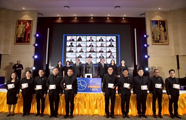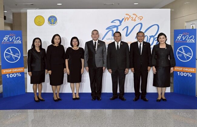 ในโอกาสนี้ รัฐมนตรีว่าการกระทรวงยุติธรรม ได้มอบชุดตรวจสารเสพติดให้กับหน่วยงานภายในสังกัดทั่วประเทศ เพื่อนำไปใช้ในการคัดกรองเจ้าหน้าที่ เด็กและเยาวชนทุกคนอย่างเข้มข้น จากนั้นได้ร่วมประกาศเจตนารมณ์เชิงสัญลักษณ์ผ่านระบบออนไลน์ ร่วมกับ ผู้อำนวยการศูนย์ฝึกและอบรมเด็กและเยาวชน แล ะสถานพินิจและคุ้มครองเด็กและเยาวชนทั่วประเทศ โดยได้รับเกียรติจากหัวหน้าส่วนราชการในสังกัดกระทรวงยุติธรรม ภาคีเครือข่ายในด้านสาธารณสุข ประกอบด้วย ผู้แทนจากกระทรวงสาธารณสุข และผู้แทนจากสถาบันบำบัดรักษาและฟื้นฟูผู้ติดยาเสพติดแห่งชาติบรมราชชนนี ตลอดจนประธานกรรมการสงเคราะห์สำหรับสถานพินิจและคุ้มครองเด็กและเยาวชนจังหวัดกรุงเทพมหานคร จังหวัดนนทบุรี จังหวัดปทุมธานี และแขกผู้มีเกียรติ เข้าร่วมงาน