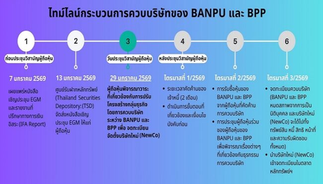 โดยก่อนหน้านี้ บริษัทฯ ได้ดำเนินการทำคำเสนอซื้อหุ้น BPP ที่เหลือทั้งหมดเป็นการทั่วไป (General Offer) ตามขั้นตอนที่เกี่ยวข้องจนแล้วเสร็จ ซึ่งส่งผลให้สัดส่วนการถือหุ้นของบริษัทฯ ใน BPP เพิ่มขึ้นจากร้อยละ 78.66 เป็นร้อยละ 91.07 ของหุ้นที่ออกและจำหน่ายได้แล้วทั้งหมดของ BPP และภายหลังการดำเนินธุรกรรมดังกล่าว บริษัทฯ ได้แจ้งอัตราส่วนการแลกหุ้นสุดท้าย (Final Swap Ratio) ต่อตลาดหลักทรัพย์ฯ เมื่อวันที่ 26 ธันวาคม 2568 โดยผู้ถือหุ้นบริษัทฯ จะได้รับหุ้นบริษัทใหม่ในอัตรา 1 หุ้นเดิมในบริษัทฯ ต่อ 0.38242 หุ้นในบริษัทใหม่ และ ผู้ถือหุ้น BPP จะได้รับหุ้นบริษัทใหม่ในอัตรา 1 หุ้นเดิมต่อ 0.80208 หุ้นในบริษัทใหม่