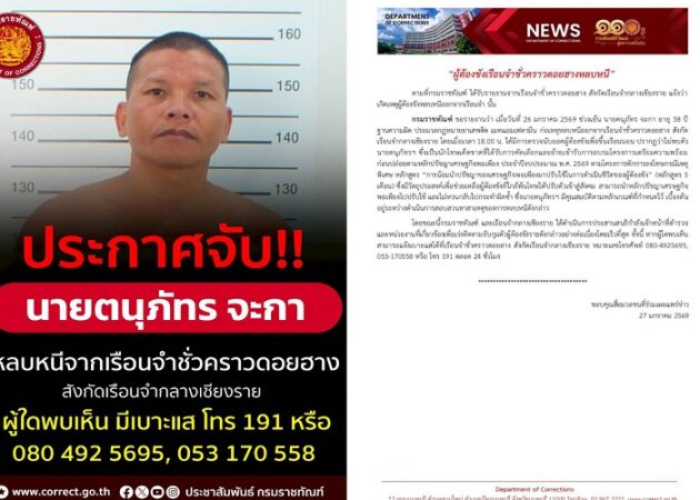 กรมราชทัณฑ์ ขอรายงานว่า เมื่อวันที่ 26 ม.ค.69 ช่วงเย็น นายตนุภัทร จะกา อายุ 38 ปี ฐานความผิด ประมวลกฎหมายยาเสพติด เมทแอมเฟตามีน ก่อเหตุหลบหนีออกจากเรือนจำชั่วคราวดอยฮาง สังกัดเรือนจำกลางเชียงราย โดยเมื่อเวลา 18.00 น. ได้มีการตรวจนับยอดผู้ต้องขังเพื่อขึ้นเรือนนอน ปรากฏว่าไม่พบตัว นายตนุภัทรฯ ซึ่งเป็นนักโทษเด็ดขาดที่ได้รับการคัดเลือกและย้ายเข้ารับการอบรมโครงการเตรียมความพร้อมก่อนปล่อยตามหลักปรัชญาเศรษฐกิจพอเพียง ประจำปีงบประมาณ พ.ศ. 2569 ตามโครงการพักการลงโทษกรณีเหตุพิเศษ หลักสูตร “การน้อมนำปรัชญาของเศรษฐกิจพอเพียงมาปรับใช้ในการดำเนินชีวิตของผู้ต้องขัง” (หลักสูตร 5 เดือน) ซึ่งมีวัตถุประสงค์เพื่อช่วยเหลือผู้ต้องขังที่ใกล้พ้นโทษให้ปรับตัวเข้าสู่สังคม สามารถนำหลักปรัชญาเศรษฐกิจพอเพียงไปปรับใช้ และไม่หวนกลับไปกระทำผิดซ้ำ ซึ่งนายตนุภัทรฯ มีคุณสมบัติตามหลักเกณฑ์ที่กำหนดไว้ เบื้องต้นอยู่ระหว่างดำเนินการสอบสวนหาสาเหตุของการหลบหนีดังกล่าว