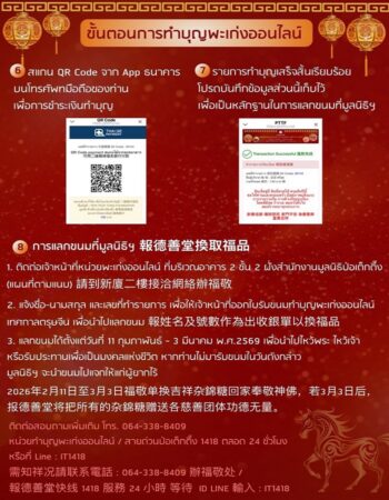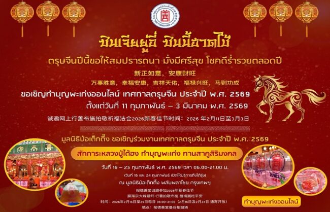 ผู้สื่อข่าวรายงานว่า ระหว่างวันที่ 16 – 25 ก.พ.69 มูลนิธิป่อเต็กตึ๊ง โดย นายวิเชียร เตชะไพบูลย์ ประธานกรรมการ ขอเชิญศิษยานุศิษย์ และสาธุชนทุกท่าน ร่วม “สักการะหลวงปู่ไต้ฮง” ขอพรเนื่องในเทศกาลตรุษจีน ลงชื่อ สวดชัยมงคลคาถา หรือ “พะเก่ง” เพื่อความเป็นสิริมงคลตลอดปี เป็นพิธีมหามงคลใหญ่ 1 ปีมีเพียงครั้งเดียว ที่เปิดให้ทุกท่านได้เลือกทำบุญพะเก่ง ๆ ละ 20 บาทตามแต่ประสงค์ ประกอบด้วย ขอให้ครอบครัวมีสุข (แกหมึ่งเก่ง) , สะเดาะเคราะห์ (ปออุ่งเก่ง) , เสริมโชคลาภ (คิ่วไฉ่เก่ง) , เสริมดวงชะตา (ส่วยกุงเก่ง) , เสริมความมั่นคงสถาพร (กึงกีเก่ง) รวมถึงทำบุญสะเดาะเคราะห์และเสริมความเป็นสิริมงคลกับรูปปั้นนักษัตรปีมะเมีย รับประทาน “สาคูสิริมงคล” เพื่อความกลมเกลียวและอยู่เย็นเป็นสุข อัญเชิญ “ฮู้แดง” (ยันต์) ของหลวงปู่ไต้ฮง เพื่อนำไปประทับหน้าบ้าน เคหะสถาน หรือพกติดตัวเพื่อคุ้มครอง “เคาะระฆังทอง” ให้ก้องกังวานเพื่อให้ชีวิตสดใส การงานรุ่งเรืองระบือไกล และ ร่วม “พิธีเวียนธูปศักดิ์สิทธิ์” เพื่อขอพรเทพยดาฟ้าดินเนื่องในวันประสูติ (ทีกงแซ) ซึ่งในปีนี้ตรงกับวันอังคารที่ 24 กุมภาพันธ์ 2569 ขออำนาจฟ้าดินเป็นที่พึ่ง ขอให้สิ่งศักดิ์สิทธิ์ที่ตนนับถือ เช่น หลวงปู่ไต้ฮง ช่วยดลบันดาลให้ประสบโชคดีตลอดปีใหม่ (โดยในวันที่ 16 และ 24 กุมภาพันธ์ 2569 มูลนิธิป่อเต็กตึ๊ง เปิดบริการโต้รุ่ง)