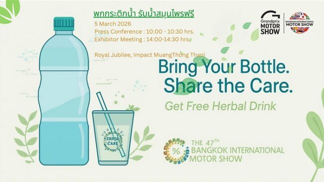 บริษัท กรังด์ปรีซ์ อินเตอร์เนชั่นแนล จำกัด (มหาชน) ในฐานะผู้นำการจัดงาน “บางกอก อินเตอร์เนชั่นแนล มอเตอร์โชว์ ครั้งที่ 47” ประกาศเดินหน้าพันธกิจด้านสิ่งแวดล้อมอย่างต่อเนื่อง เป็นปีที่ 2 กับโครงการ “พกกระติกน้ำ รับน้ำสมุนไพรฟรี” หลังได้รับผลตอบรับอย่างดีเยี่ยมในปีที่ผ่านมา เพื่อรณรงค์ลดขยะพลาสติกและสร้างวัฒนธรรมการบริโภคที่ยั่งยืนภายใต้กรอบแนวคิด ESG (Environmental, Social, and Governance) ในงานแถลงข่าว และประชุมผู้เข้าร่วมออกงาน (Exhibitor Meeting) ยังคงมุ่งเน้นสร้างการมีส่วนร่วมในการรณรงค์ลดขยะ โดยส่งเสริมให้สื่อมวลชน ผู้เข้าร่วมออกงาน คณะทำงาน พกพากระติกน้ำหรือภาชนะส่วนตัวเพื่อลดการใช้บรรจุภัณฑ์แบบใช้ครั้งเดียวทิ้ง (Single-use Plastic) มาเติมเครื่องดื่มน้ำสมุนไพรเพื่อสุขภาพฟรี ณ จุดบริการบริเวณหน้าห้องแถลงข่าว ในวันที่ 5 มีนาคม 2569 ณ ห้องรอยัล จูบิลี่ อิมแพ็ค เมืองทองธานี
