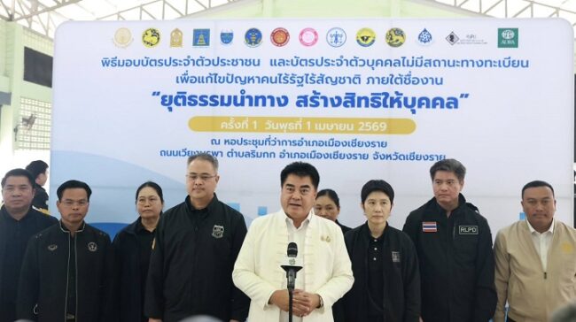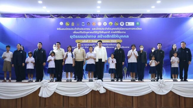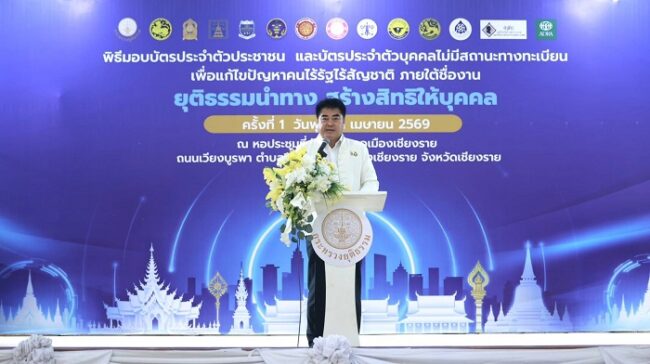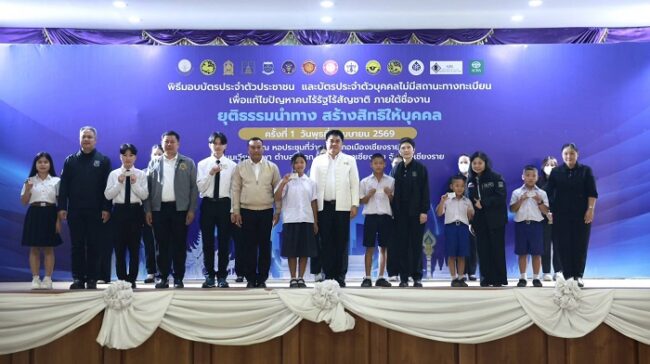 เมื่อเวลา 10.00 น. วันที่ 1 เม.ย.69 กรมคุ้มครองสิทธิและเสรีภาพ โดย กองพิทักษ์สิทธิและเสรีภาพ ได้ประสานงานร่วมมือกับ อำเภอเมืองเชียงราย จังหวัดเชียงราย ทีมบูรณาการกระทรวงยุติธรรม และภาคีเครือข่ายภาคประชาสังคมที่เกี่ยวกับการให้ความช่วยเหลือกลุ่มเปราะบางไร้รัฐไร้สัญชาติ จัดพิธีมอบบัตรประจำตัวประชาชนและบัตรประจำตัวบุคคลที่ไม่มีสถานะทางทะเบียนเพื่อแก้ไขปัญหาคนไร้รัฐไร้สัญชาติ ภายใต้ชื่องาน “ยุติธรรมนำทาง สร้างสิทธิให้บุคคล ครั้งที่ 1” โดยได้รับเกียรติจาก นายชูชีพ พงษ์ไชย ผู้ว่าราชการจังหวัดเชียงราย เป็นประธานพิธีมอบบัตรประจำตัวบุคคลที่ไม่มีสถานะทางทะเบียนกลุ่มนักเรียนที่มีเลขประจำตัวขึ้นต้นด้วยอักษร G ภายใต้นโยบายนำความยุติธรรมเข้าหาประชาชน และมี นายญาณวุฒิ สุดพิมศรี นายอำเภอเมืองเชียงราย กล่าวรายงาน และ นางสาวดวงดาว เกียรติพิศาลสกุล รองอธิบดีกรมคุ้มครองสิทธิและเสรีภาพ กล่าวขอบคุณ โดยมีผู้มีคุณสมบัติครบถ้วนตามกฎหมายเข้ารับมอบบัตรประจำตัวฯ จำนวน 52 ราย ณ หอประชุมที่ว่าการอำเภอเมืองเชียงราย อ.เมืองเชียงราย จ.เชียงราย