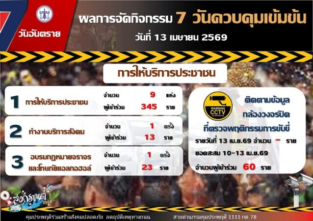 ร.ต.อ.ปิยะ รักสกุล อธิบดีกรมคุมประพฤติ เปิดเผยผลการติดตามสถานการณ์คดีในช่วงเทศกาลสงกรานต์ พ.ศ. 2569 ว่า ในวันที่ 13 เมษายน 2569 ซึ่งเป็นวันที่ 4 ของการดำเนินมาตรการควบคุมเข้มข้น พบว่ามีคดีเข้าสู่กระบวนการคุมความประพฤติ รวมทั้งสิ้น 1,544 คดี แบ่งออกเป็น คดีขับรถในขณะเมาสุรา จำนวน 1,463 คดี คิดเป็นร้อยละ 94.7 คดีขับรถประมาท จำนวน 1 คดี คิดเป็นร้อยละ 0.1 คดีขับเสพ จำนวน 79 คดี คิดเป็นร้อยละ 5.1 และคดีขับซิ่ง จำนวน 1 คดี คิดเป็นร้อยละ 0.1 ขณะที่ยอดคดีสะสมตลอด 4 วัน (10 – 13 เมษายน 2569) จำนวนรวมทั้งสิ้น 3,294 คดี แบ่งเป็น คดีขับรถขณะเมาสุรา จำนวน 3,076 คดี คิดเป็นร้อยละ 93.4 คดีขับรถประมาท จำนวน 4 คดี คิดเป็นร้อยละ 0.1 คดีขับเสพ จำนวน 213 คดี คิดเป็นร้อยละ 6.47 และคดีขับซิ่ง จำนวน 1 คดี คิดเป็นร้อยละ 0.03