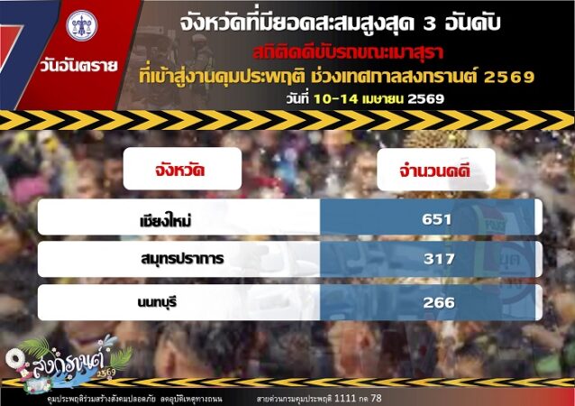 สำหรับจังหวัดที่มีสถิติคดีขับรถขณะเมาสุราสูงสุด 3 อันดับแรก ได้แก่ เชียงใหม่ 651 คดี สมุทรปราการ 317 คดี และนนทบุรี 266 คดี