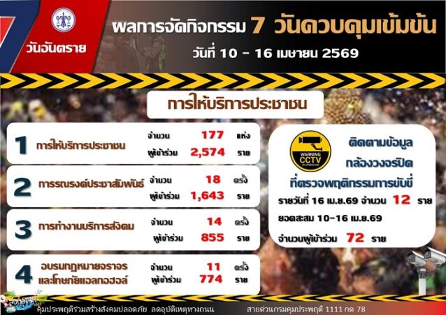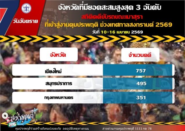สำหรับยอดคดีสะสมตลอด 7 วัน ระหว่างวันที่ 10-16 เมษายน 2569 มีจำนวนทั้งสิ้น 6,180 คดี โดยเป็นคดีขับรถขณะเมาสุรา 5,806 คดี คิดเป็นร้อยละ 93.95 คดีขับรถขณะเสพยาเสพติด 366 คดี คิดเป็นร้อยละ 5.92 คดีขับรถประมาท 5 คดี คิดเป็นร้อยละ 0.08 และ คดีขับซิ่ง 3 คดี คิดเป็นร้อยละ 0.05