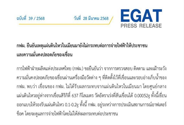กฟผ. ยืนยันเหตุแผ่นดินไหวในเมียนมายังไม่กระทบต่อการจ่ายไฟฟ้าให้ประชาชน และความมั่นคงปลอดภั…