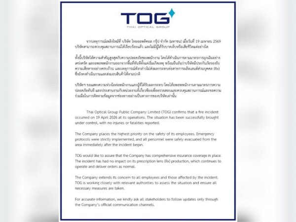 Read MoreTOG คุมเหตุเพลิงไหม้ได้แล้ว พนักงานปลอดภัย มีประกันรองรับ ย้ำผลกระทบจำกัด เร่งฟื้นฟูการผลิตขั้นต้น